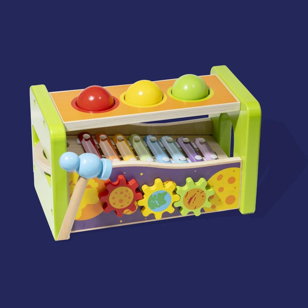 هي عبارة عن لعبتين في واحدة, لعبة دفع الكرات والإكسيليفون. تحتوي على 3 كرات ملونة ومطرقة لدفع الكرات والنقر على لوح الاكسيليفون.