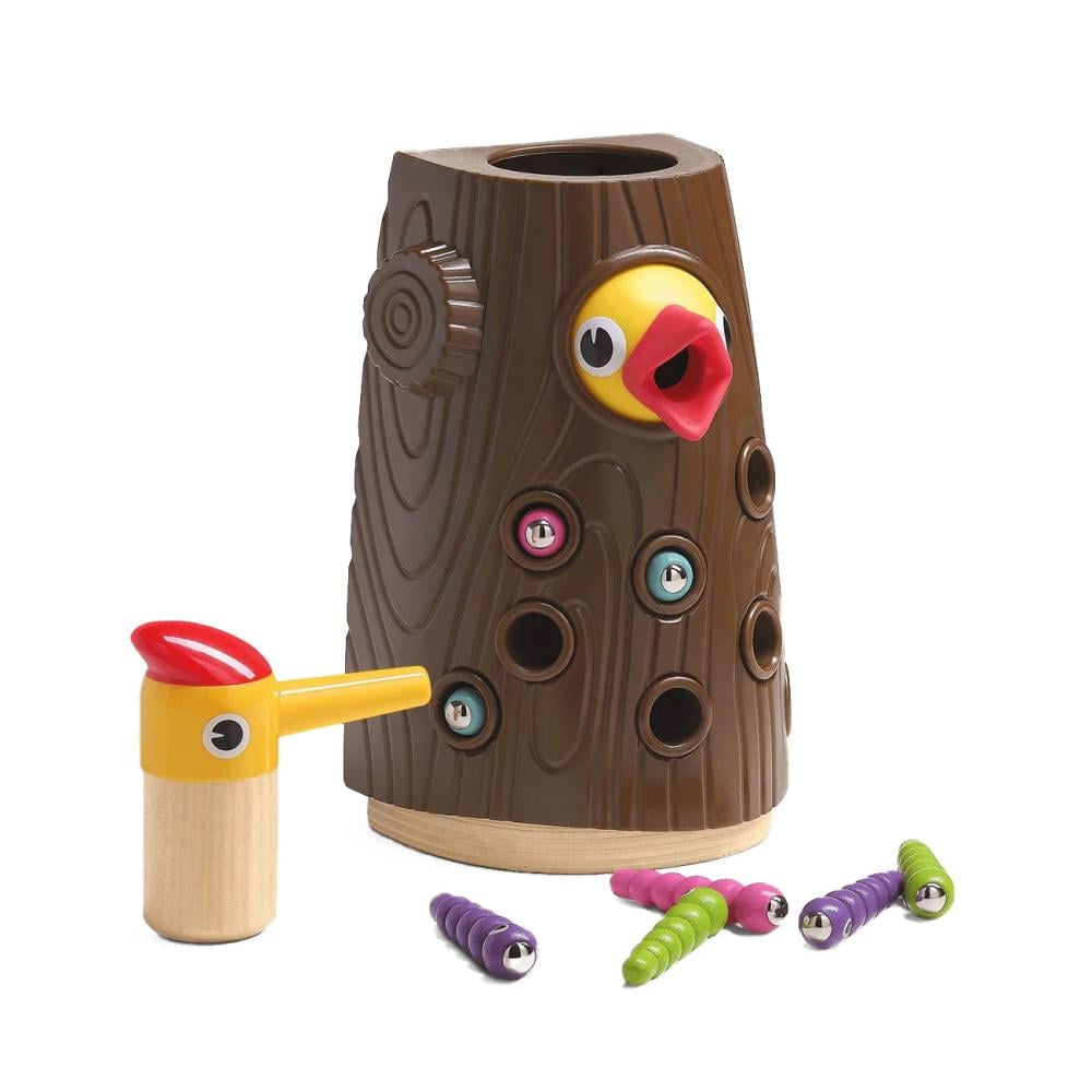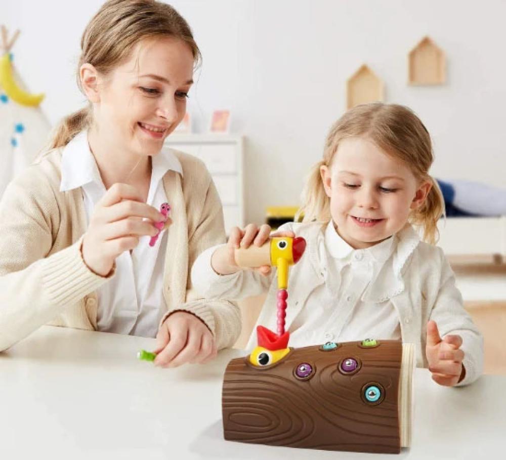 تحاكي هذه اللعبة التعليمية دور الأمهات في عالم الطبيعة؛ فيستخدم الطفل نقار خشب خشبي مغناطيسي لالتقاط ديدان ملونة من داخل جِذع شجرة، ثم يغذّي بها "الطائر الصغير"، مما يثري تجربة التمثيل والتعلم.
