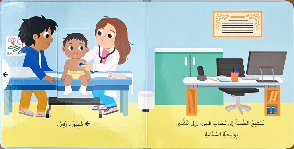 كتاب تفاعلي بألوان ورسومات جذابة تفاعلية قابلة للتحريك تساعد الطفل على فهم ما يجري عند الطبيب من غرفة الإنتظار إلى الفحص في العيادة وتلقي العلاج بشكل مبسط.