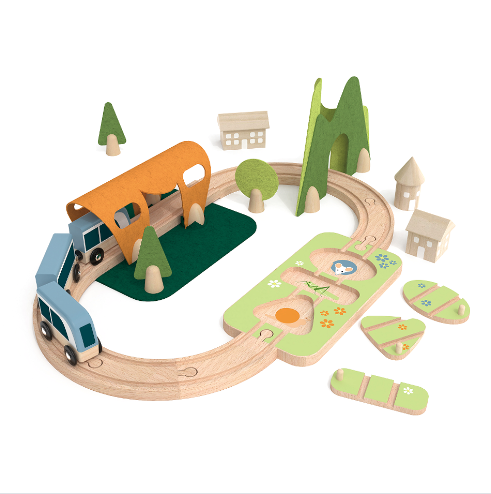 مجموعة القطار الخشبي هي لعبة قطار شامل تتضمن مسارًا قابلًا للتجميع، نفقًا، محطة، وعناصر إضافية مثل كتل بناء صغيرة تشكل المنازل والأشجار. تأتي مع مظاهر مذهلة من الصوف الملون (فيلت) تضفي واقعية وحيوية عند اللعب