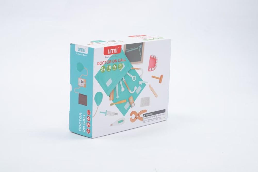 مجموعة الطبيب الخشبية تحتوي على أدوات طبية مصغّرة مصنوعة بالكامل من الخشب، لمحاكاة أجواء عيادة الطبيب بطريقة مرحة وآمنة.